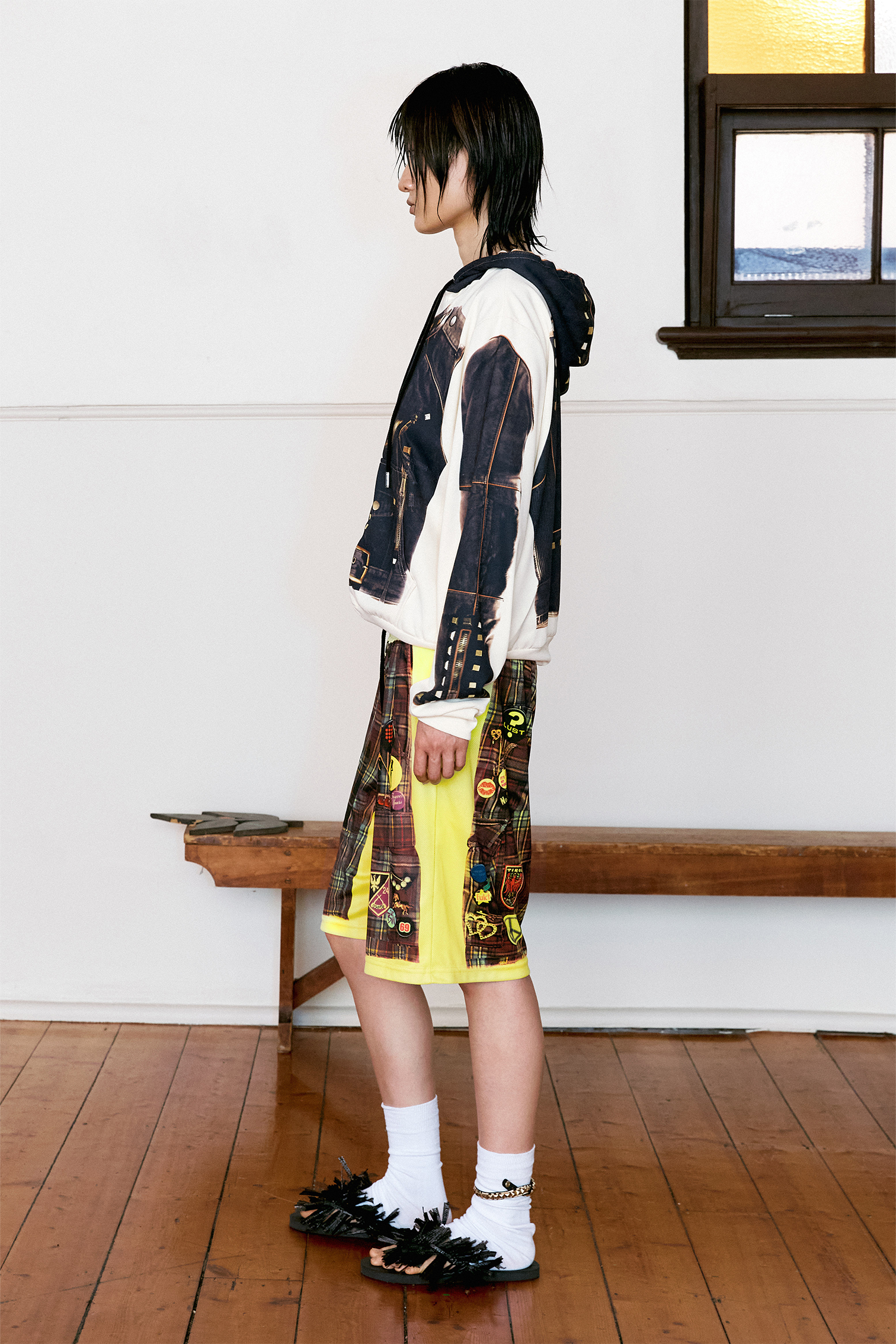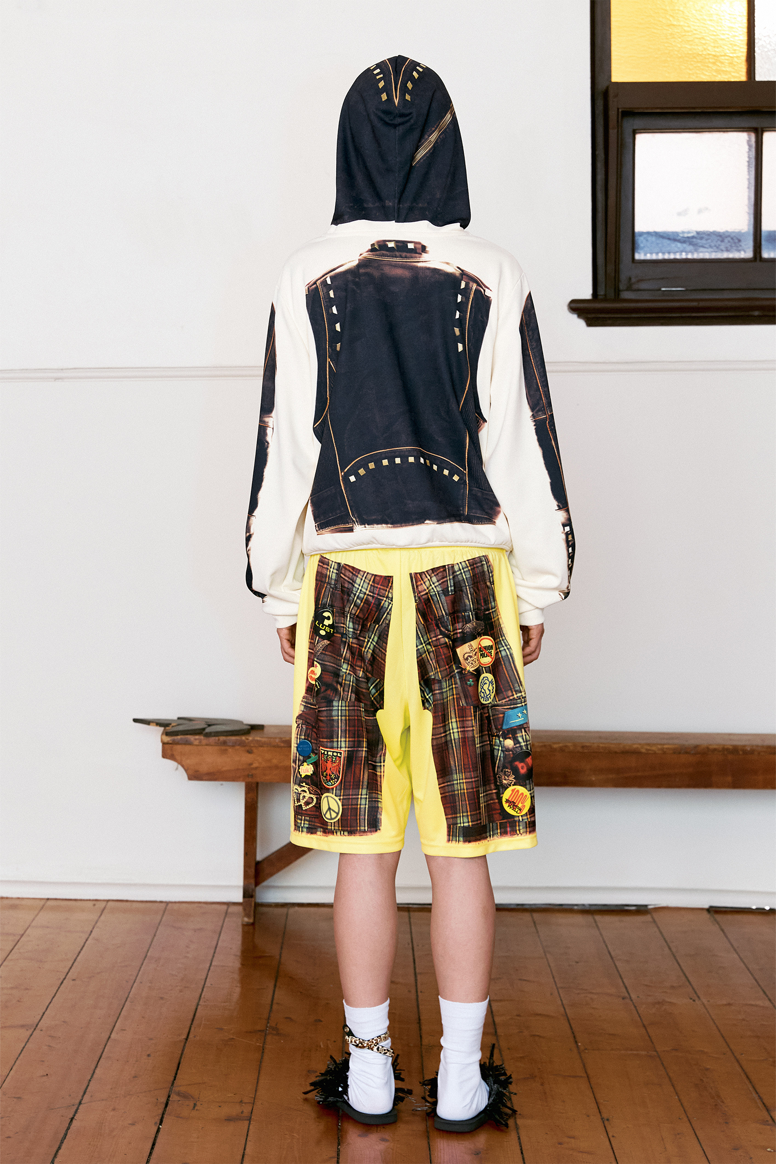 The original shorts were sourced secondhand, embellished with found brooches and custom badges, digitally recontextualised and printed onto highly durable sport fabric. The print was then constructed into a pair of new, considered shorts.