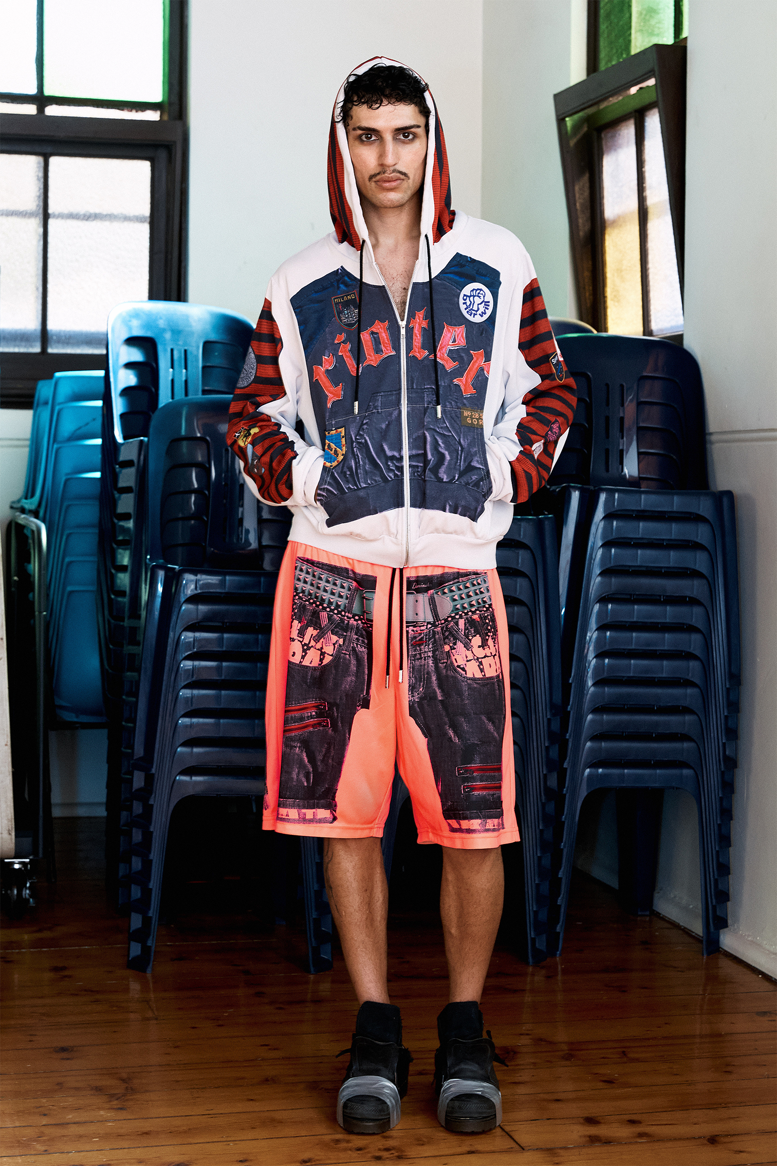 The original shorts were sourced secondhand, belted, digitally recontextualised and printed onto highly durable sport fabric. The print was then constructed into a pair of new, considered shorts.