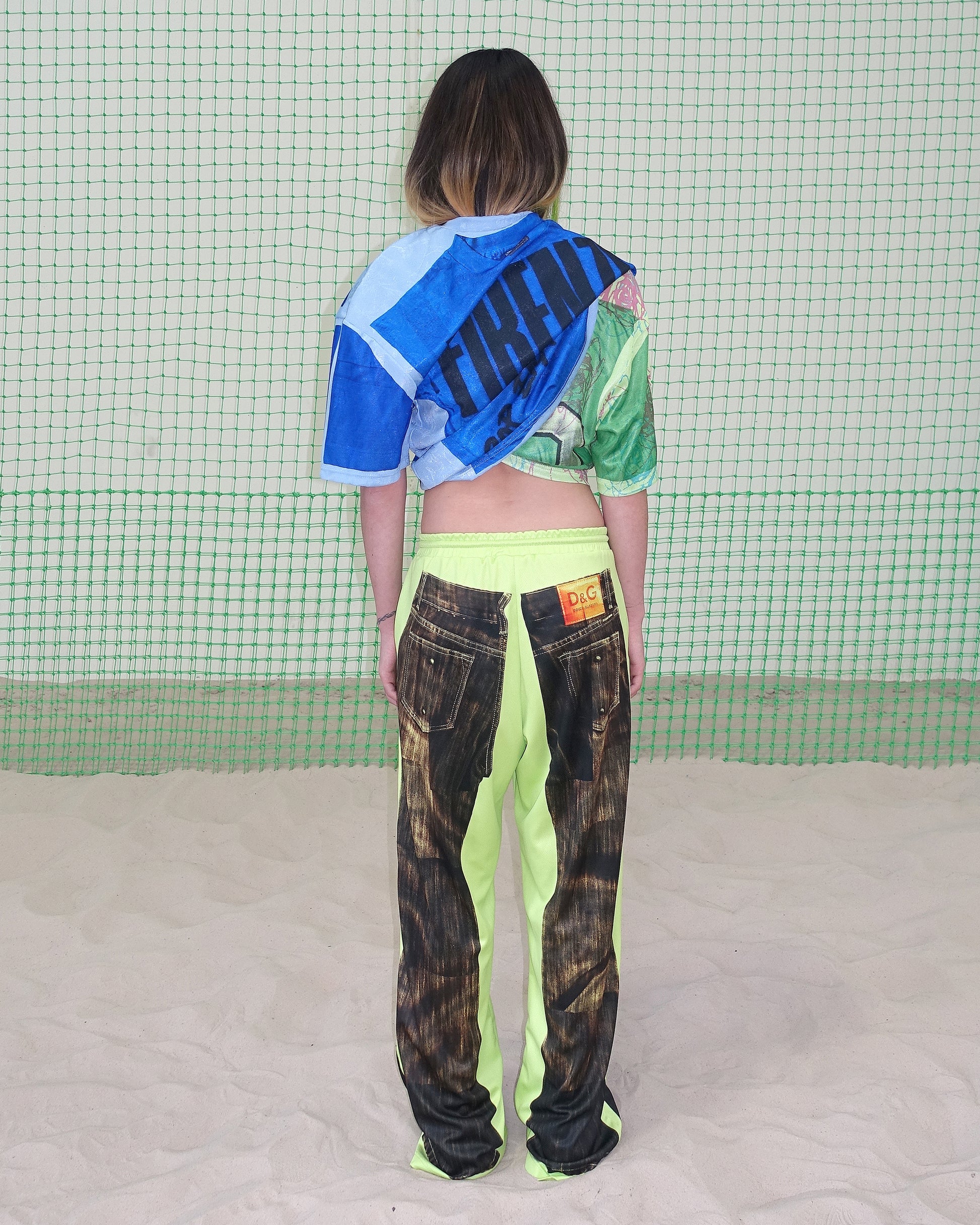 The original jeans were sourced from an op shop, digitally recontextualised and printed on end-of-roll fabric. The print was then constructed into new, considered pants.
