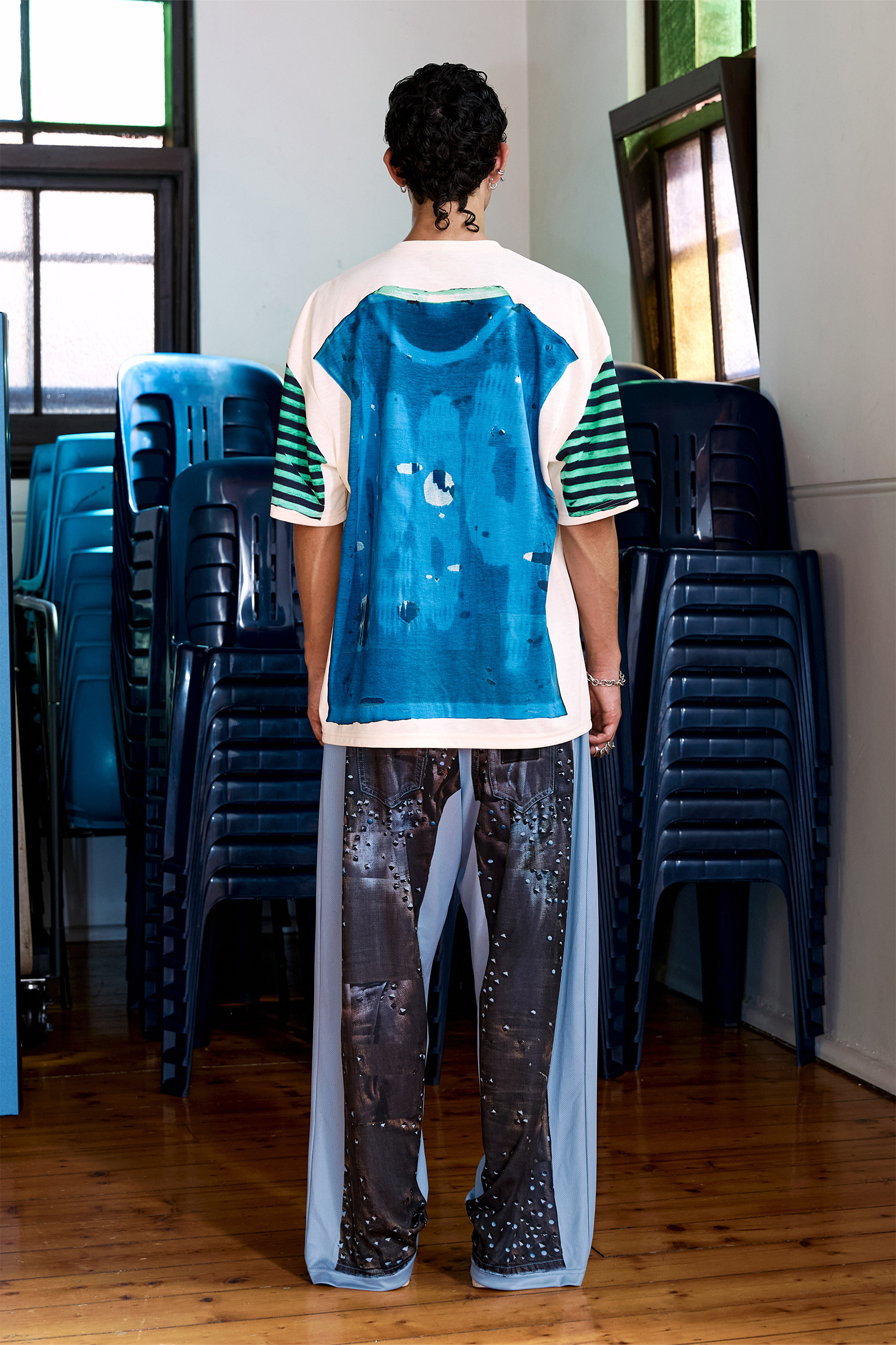 The original t-shirt was sourced secondhand, screen printed by hand, digitally recontextualised and printed onto cotton-feel knit fabric. The print was then constructed into a new, considered t-shirt.