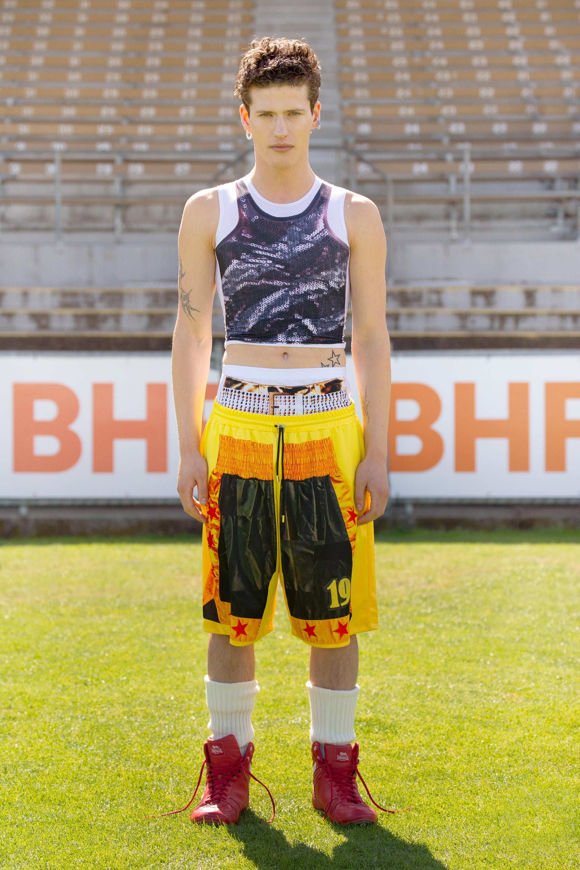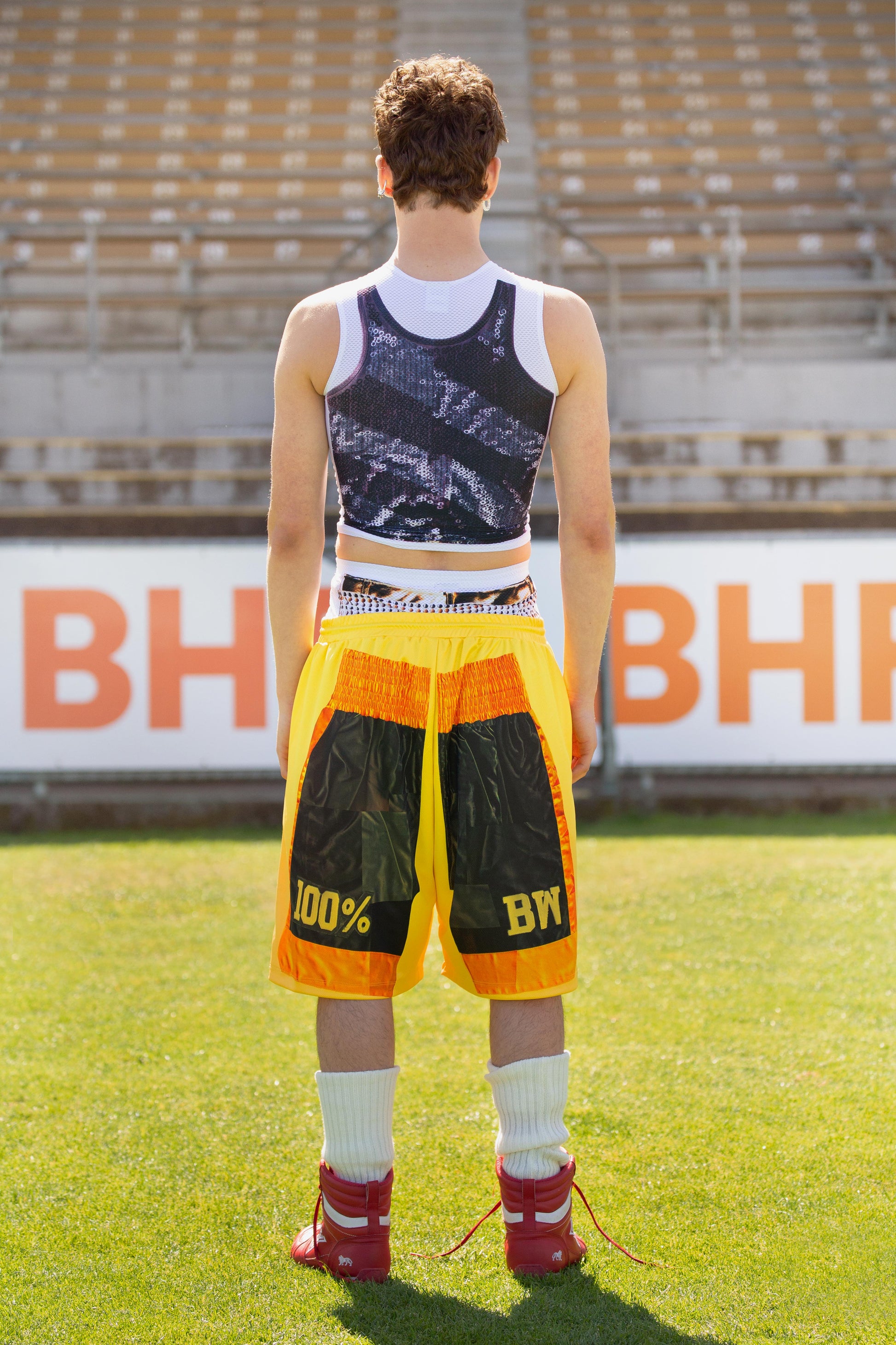 The original boxing shorts were sourced from an op shop, digitally recontextualised and printed onto highly durable sport fabric. The print was then constructed into new, considered shorts.